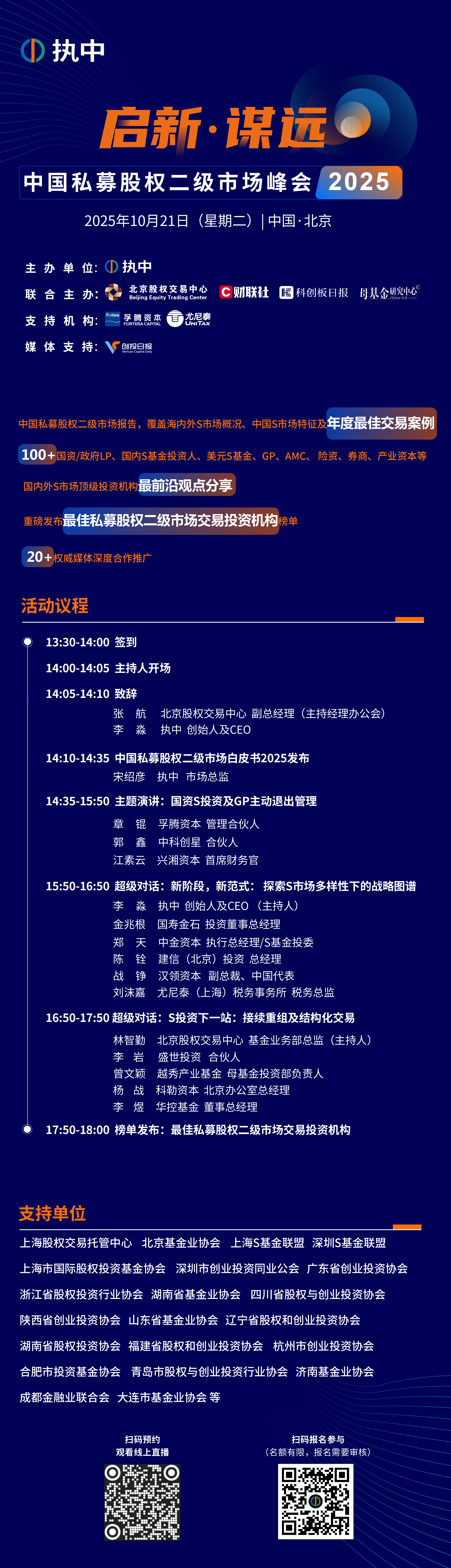 在此背景下,执中联合北京股权交易中心、财联社、科创板日报、母基金研究中心,将于10月21日在北京举办“启新·谋远——中国私募股权二级市场峰会2025”。