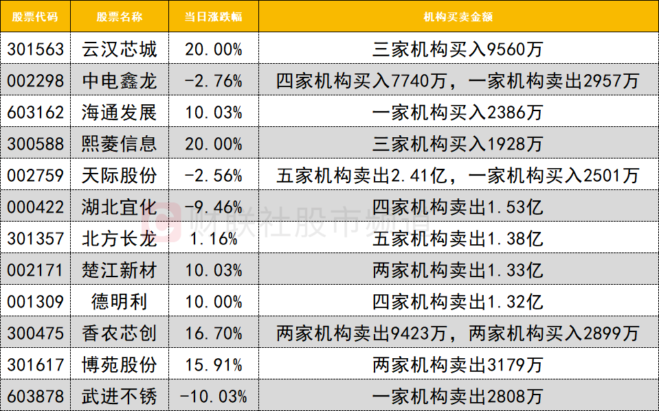 今日龙虎榜机构活跃度明显降低,买入个股数量和净买入规模大幅减少。今日20cm涨停的云汉芯城获三家机构买入9560万。