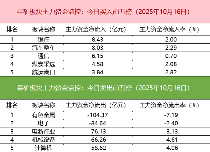 从主力板块资金监控数据来看,银行板块主力资金净流入居首。