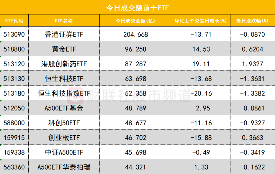 从成交额前十的ETF来看,香港证券ETF(513090)成交额位居首位,黄金ETF(518880)成交额位居次席。