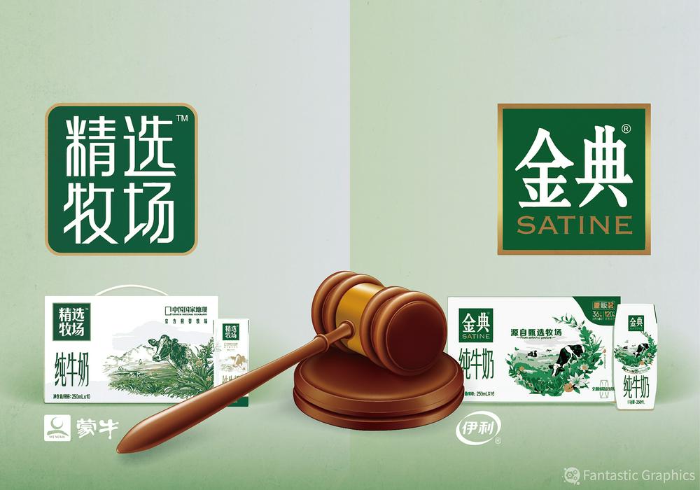 关于侵权认定,法院指出,“精选牧场”牛奶与“金典”牛奶包装在墨绿色底框及白色字体标识、“纯牛奶”等标注样式、插画主题与色调、侧面墨绿色底色等要素上较为接近,整体视觉效果趋同。两款商品均为常温箱装牛奶,通常一起堆放销售,蒙牛公司未在“精选牧场”牛奶显著位置使用“蒙牛”注册商标,弱化了品牌区分功能,结合“金典”牛奶的市场知名度及实际发生的消费者误认情况,足以认定构成不正当竞争。