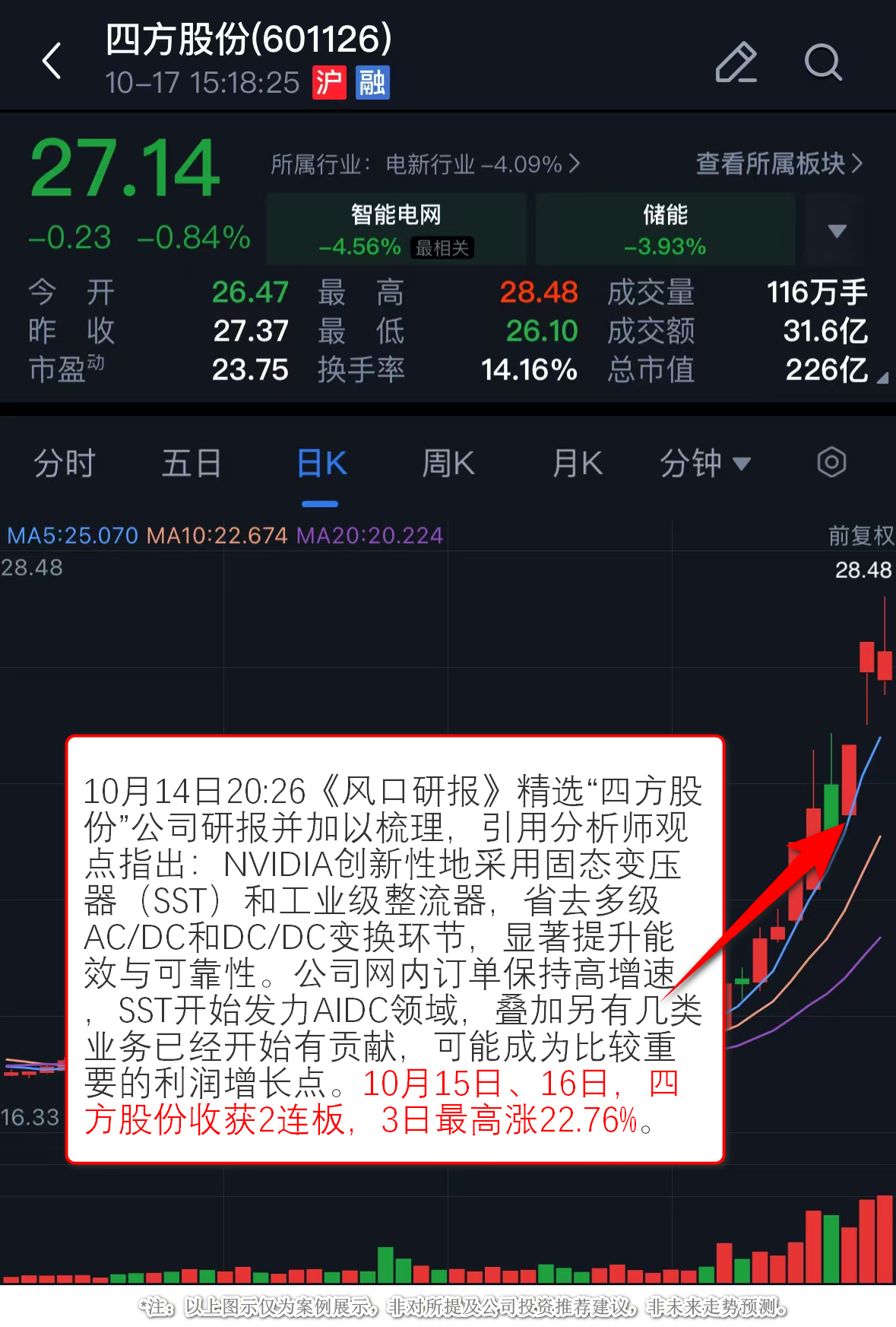 10月15日、16日,四方股份强势收获2连板,截至17日收盘,其区间最高涨幅达22.76%。