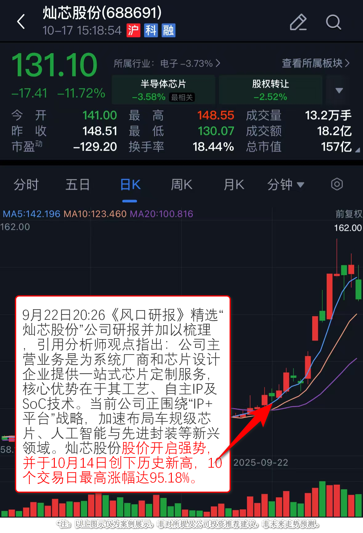 结合灿芯股份股价走势图来看,栏目对其的覆盖精准始于“起涨点”,此后股价开启强势上涨通道,并于10月14日创下历史新高,10个交易日最高涨幅达95.18%。