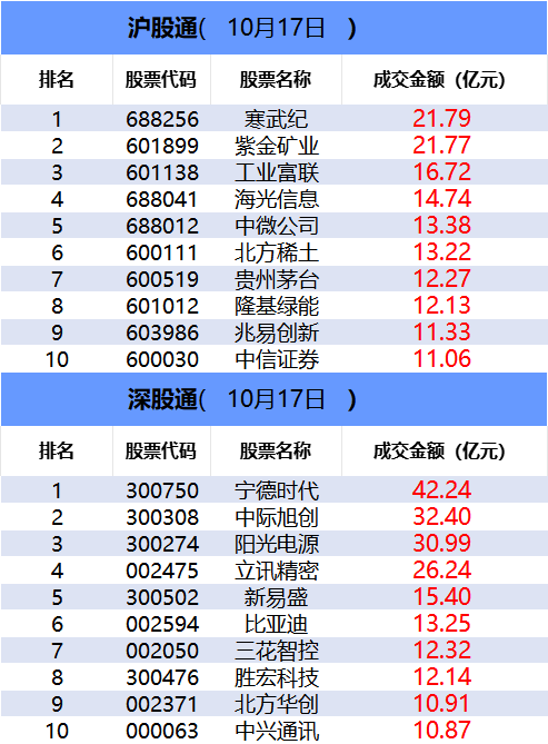 从沪股通前十大成交个股来看,寒武纪位居首位;紫金矿业和工业富联分居二、三位。