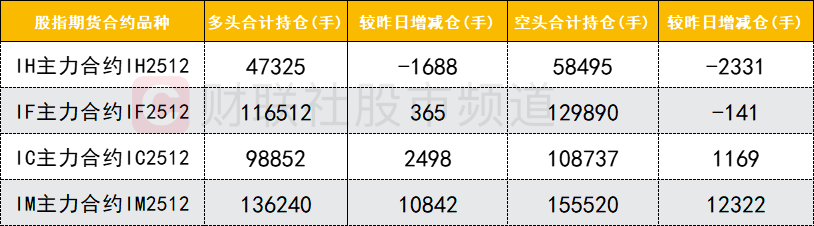 四大期指主力合约中,IC、IM合约多空双方均加仓,IM合约空头加仓数量较多,IH合约多空双方均减仓。