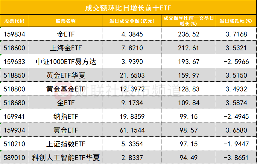 从成交额环比增长前十的ETF来看,金ETF(159834)成交额环比增长236%位居首位;上海金ETF(518600)成交额环比增长212%位居次席。