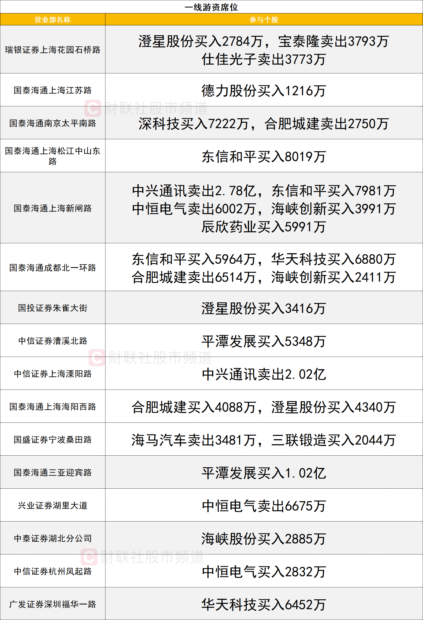 一线游资活跃度较高,今日跌停的中兴通讯遭两家实力游资(国泰海通上海新闸路和中信证券上海溧阳路)分别卖出2.78亿和2.02亿。澄星股份获三家一线游资买入1.05亿。平潭发展获两家一线游资买入1.55亿。