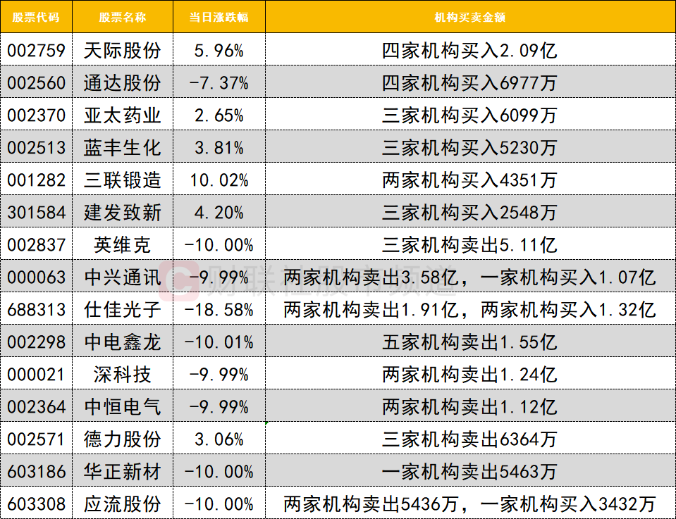 卖出方面,今日跌停的中兴通讯遭两家机构卖出3.58亿。英维克遭三家机构卖出5.11亿