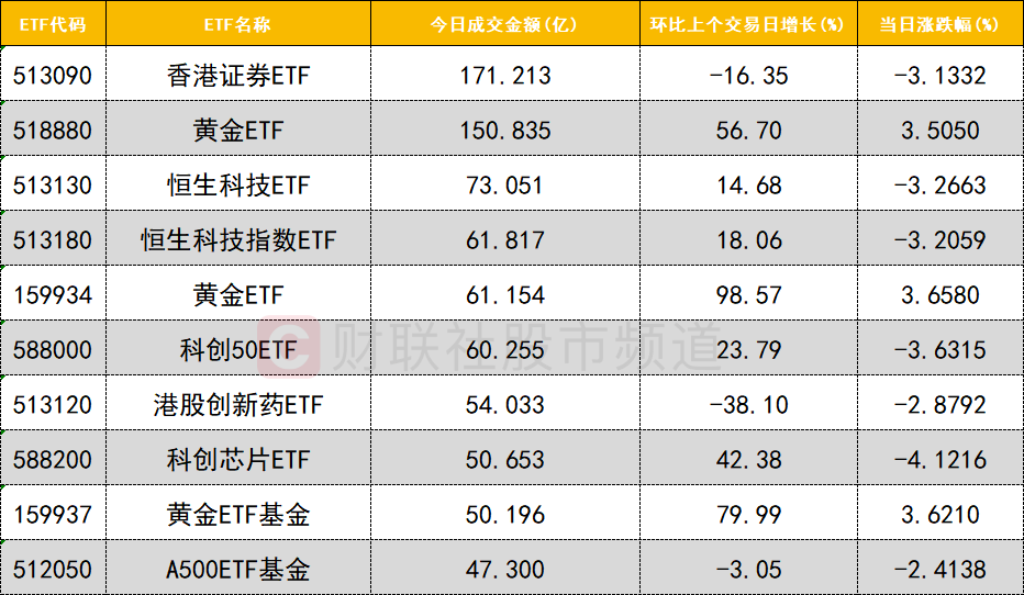从成交额前十的ETF来看,香港证券ETF(513090)成交额位居首位,黄金ETF(518880)成交额位居次席。