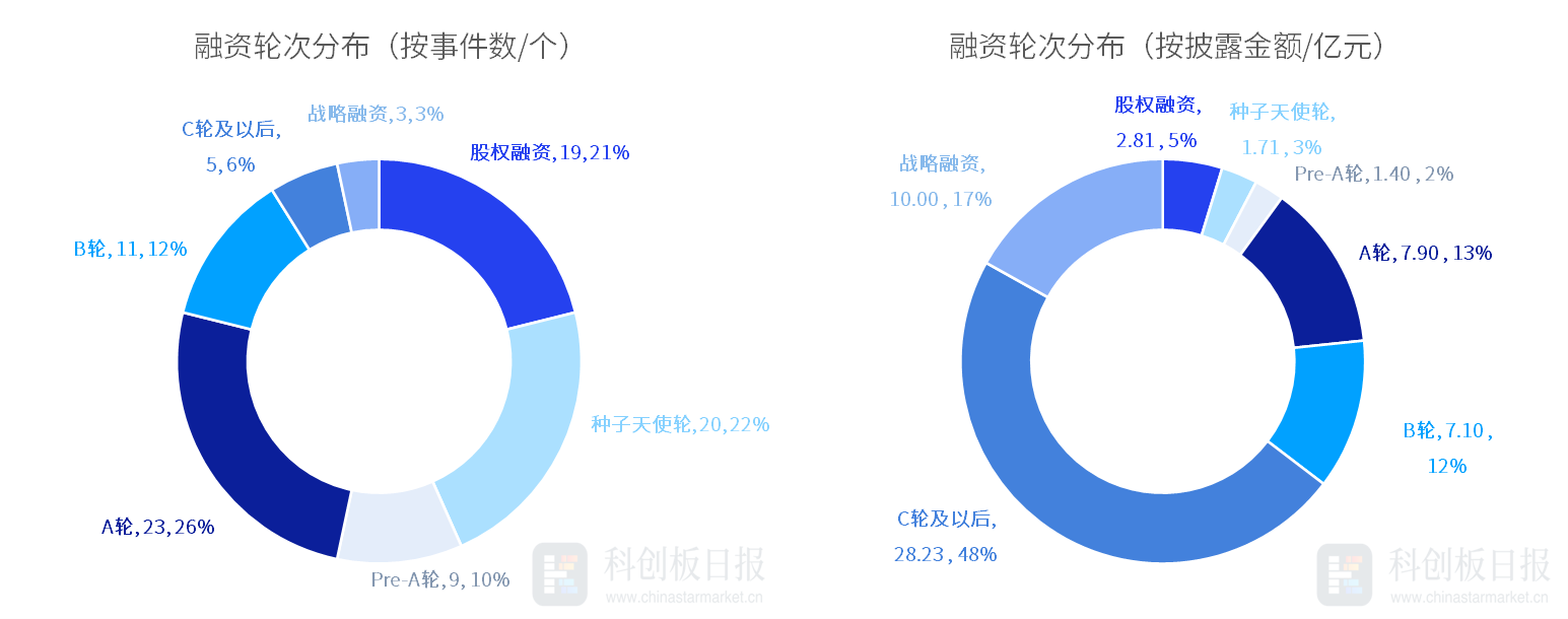 从投资轮次来看,除股权融资外,本周A轮融资事件数最多,发生23起,占比约26%;其次是种子天使轮,发生20起,占比约22%。从各轮次获投金额来看,C轮及以后披露的融资总额最高,约28.23亿元;其次是战略融资,约10亿元。