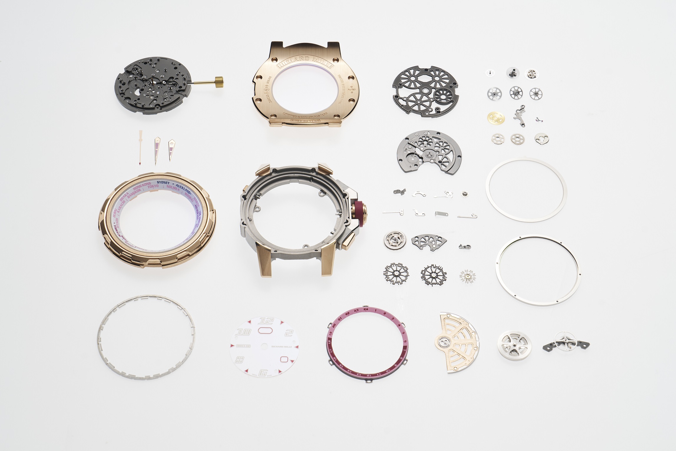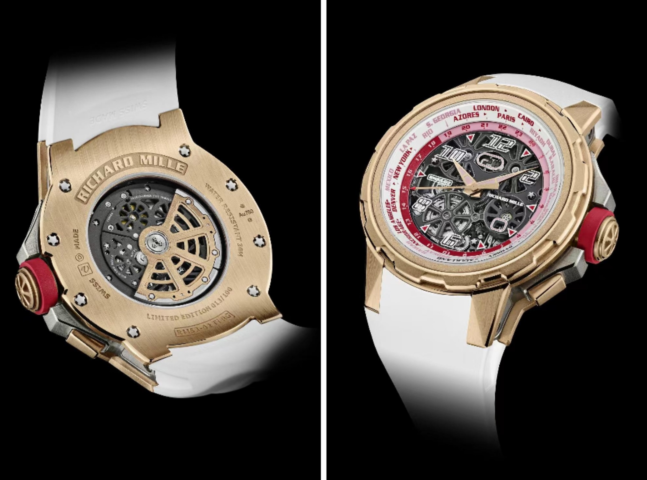 RM 63-02搭载直径47毫米、厚度13.45毫米的圆形表壳,由丝光打磨5N红金经铣削成型,辅以抛光斜角处理,中层表壳采用五级钛合金打造,其表面润饰与正面完美呼应。三件式表壳内含106枚零件,其中12枚零件专为驱动世界时表圈而生,另有86枚CRMA4机芯零件协同实现此精密时区机制。