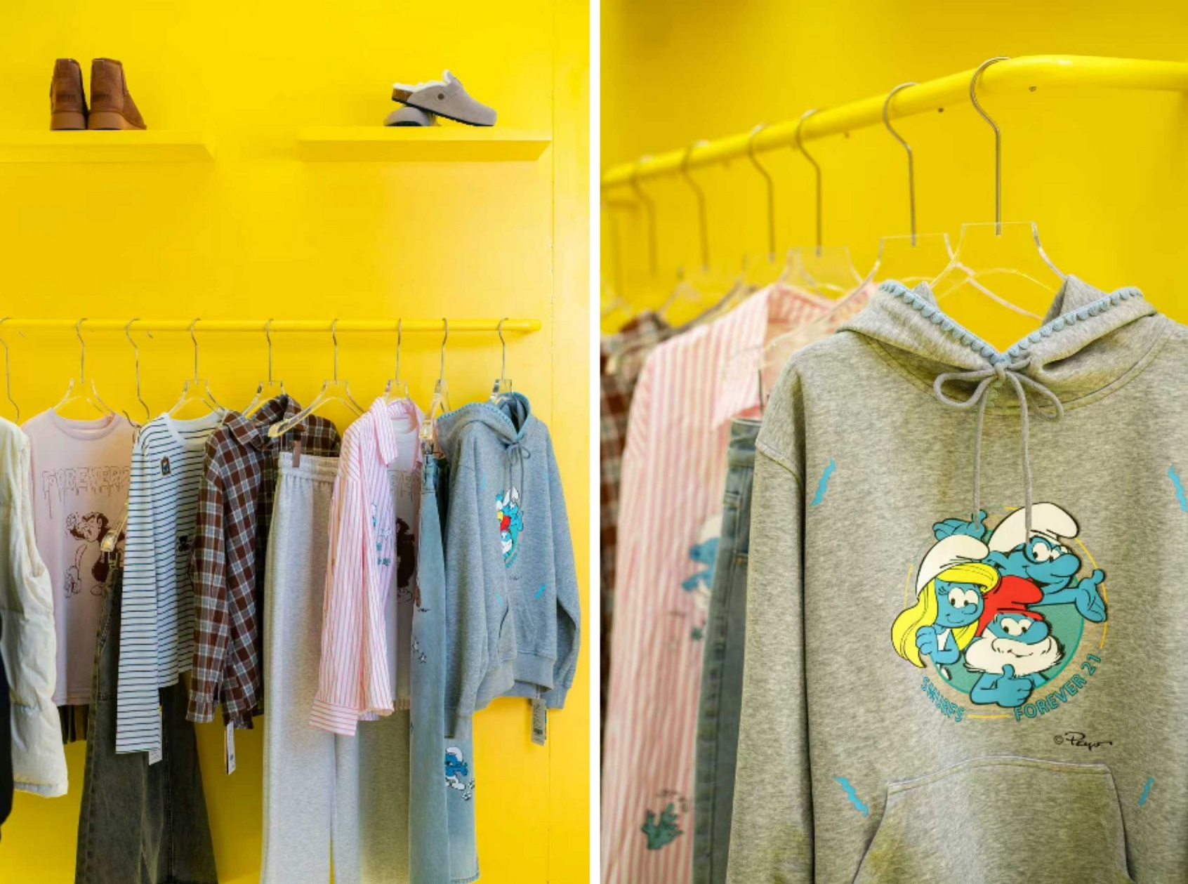 Forever 21 2025秋冬系列以经典学院元素为基底,结合当下流行廓形与材质,打破传统框架,实现硬朗与柔软、经典与潮流的自由混搭。蓝精灵联名系列将童话叙事融入日常穿搭,以蘑菇村、精灵图案等设计细节唤起消费者的童年记忆,打造出一个充满趣味与幻想的潮流衣橱,精准捕捉Z世代“重返童年”的情感需求。