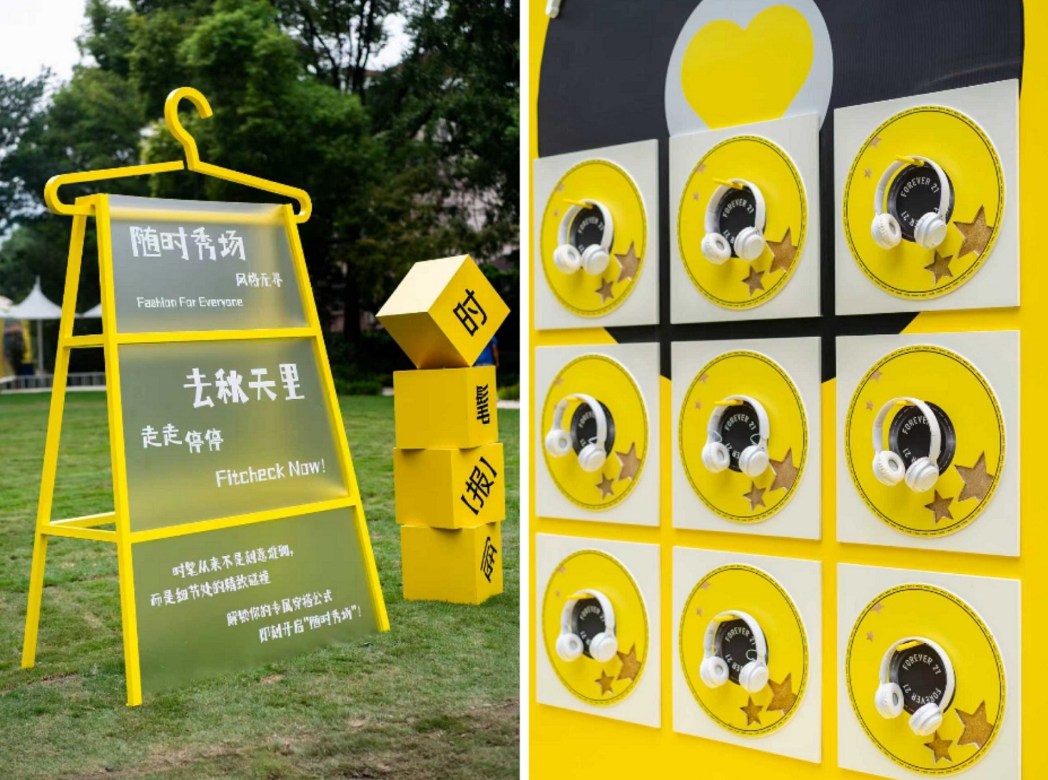 在上海时尚周末近3000平方米的活动空间里,Forever 21以“随时秀场“为主题,特别打造了一处以品牌经典购物袋造型为灵感的快闪空间,深度契合Z世代对“打卡“社交与体验式消费的偏好。装置以品牌标志性的明黄色为主调,融入开放式草坪的自然氛围,营造出年轻人独有的时尚态度,亦作为Forever 21产品系列的展示空间,呈现了品牌2025秋冬“时髦菁英”系列及与全球经典IP《蓝精灵》合作的联名系列。