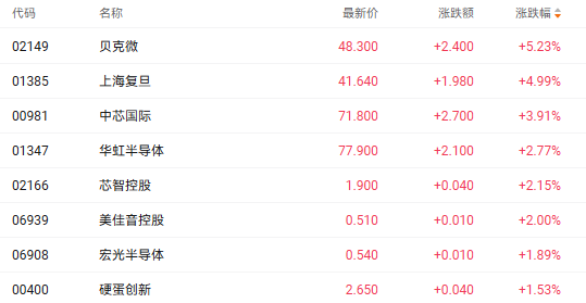 截至收盘,贝克微(02149.HK)、上海复旦(01385.HK)、中芯国际(00981.HK)分别上涨5.23%、4.99%、3.91%。