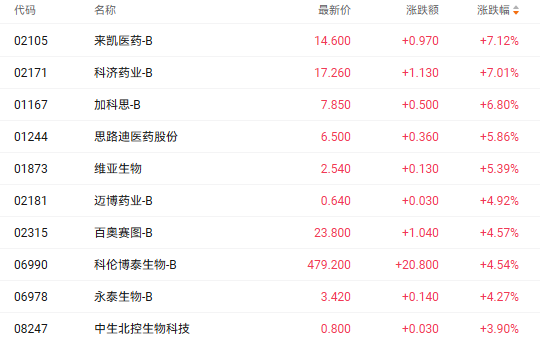 截至收盘,来凯医药-B(02105.HK)、科济药业-B(02171.HK)、维亚生物(01873.HK)分别上涨7.12%、7.01%、5.39%。