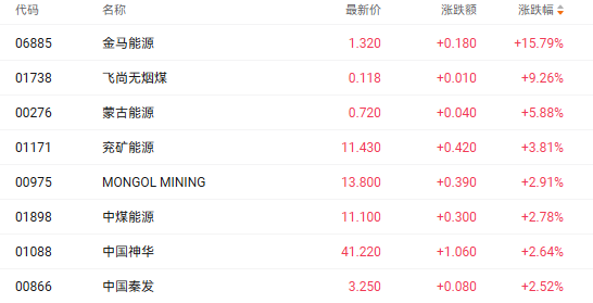截至收盘,金马能源(06885.HK)、蒙古能源(00276.HK)、兖矿能源(01171.HK)分别上涨15.79%、5.88%、3.81%。