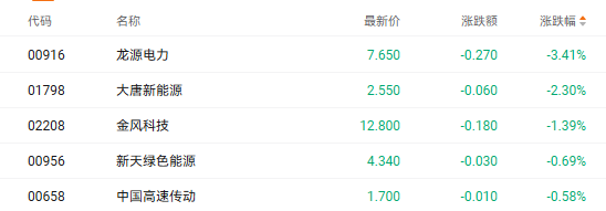 截至收盘,龙源电力(00916.HK)、大唐新能源(01798.HK)、金风科技(02208.HK)分别下跌3.41%、2.30%、1.39%。