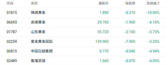 截至收盘,珠峰黄金(01815.HK)、赤峰黄金(06693.HK)、山东黄金(01787.HK)分别下跌10%、6.18%、5.75%。