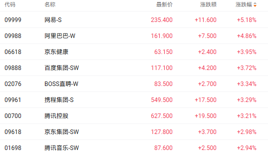 截至收盘,网易-S(09999.HK)、阿里巴巴-W(09988.HK)、百度集团-SW(09888.HK)分别上涨5.18%、4.86%、3.72%。