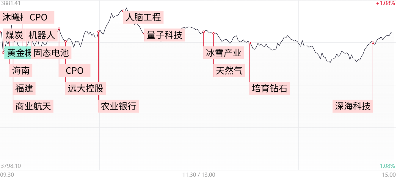 ②盘面上来看,科技股集体反弹,存储芯片全线爆发,逾20股涨超10%,而算力硬件、商业航天等同样涨幅居前。