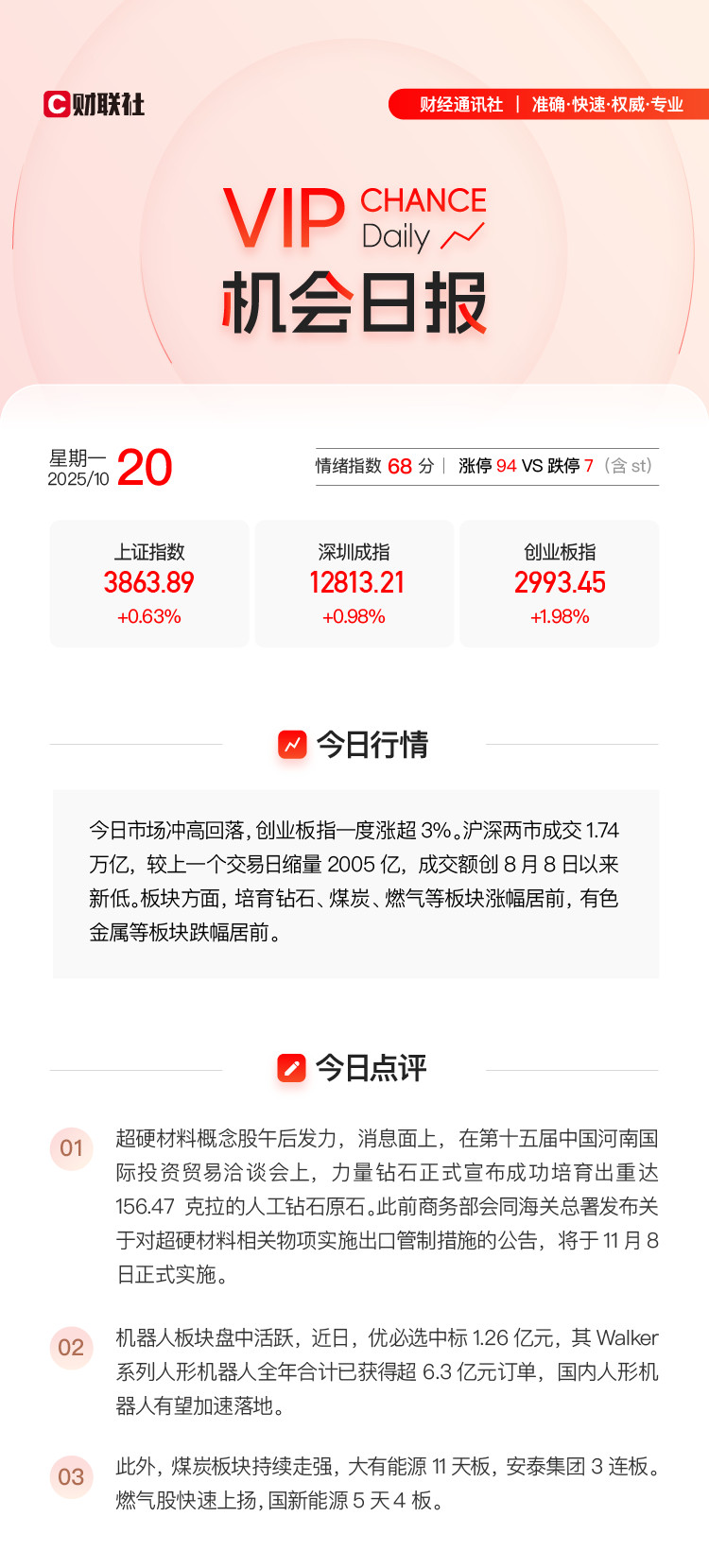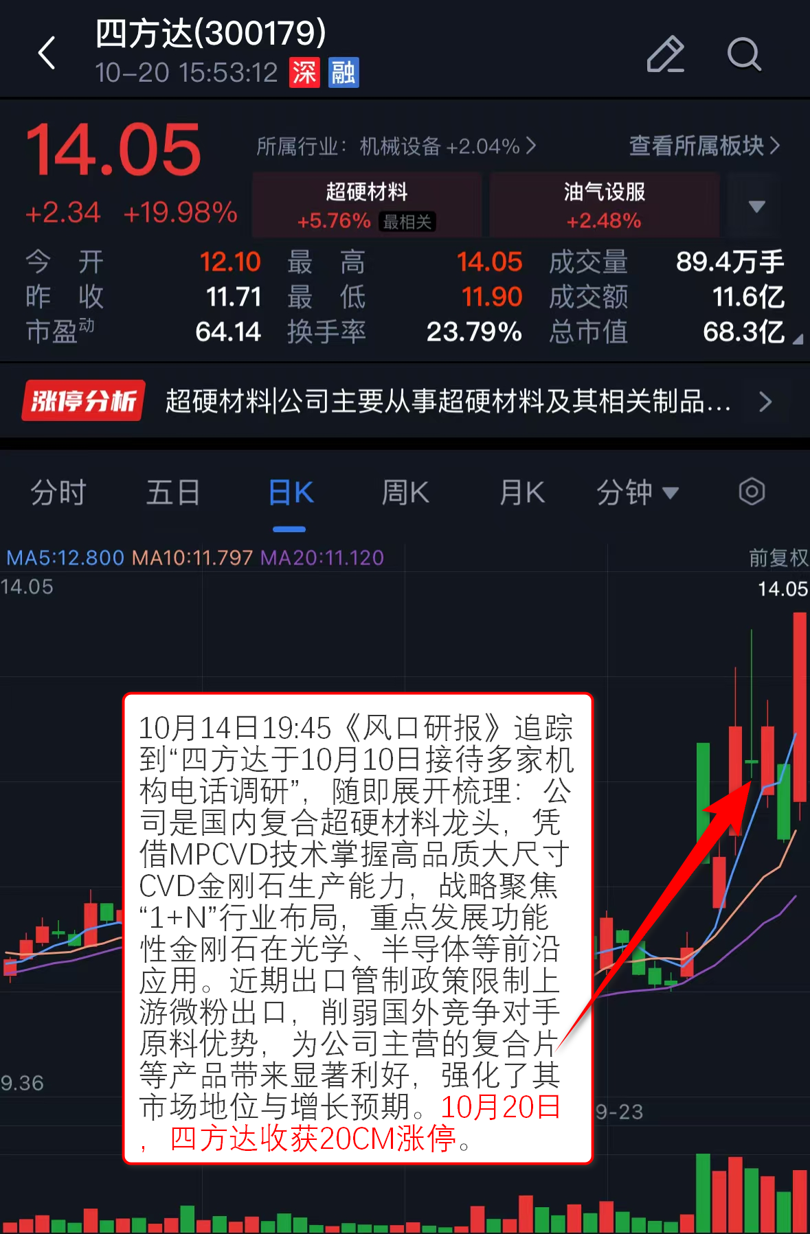 10月14日19:45《风口研报》追踪到“四方达于10月10日接待多家机构电话调研”,随即展开梳理:公司是国内复合超硬材料龙头,凭借MPCVD技术掌握高品质大尺寸CVD金刚石生产能力,战略聚焦“1+N”行业布局,重点发展功能性金刚石在光学、半导体等前沿应用。近期出口管制政策限制上游微粉出口,削弱国外竞争对手原料优势,为公司主营的复合片等产品带来显著利好,强化了其市场地位与增长预期。其在10月20日收获20cm涨停。