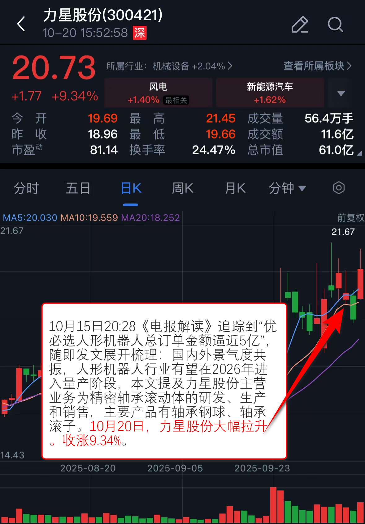 10月15日20:28《电报解读》追踪到“优必选人形机器人总订单金额逼近5亿”,随即发文展开梳理:国内外景气度共振,人形机器人行业有望在2026年进入量产阶段,本文提及力星股份主营业务为精密轴承滚动体的研发、生产和销售,主要产品有轴承钢球、轴承滚子。10月20日,力星股份大幅拉升。收涨9.34%。