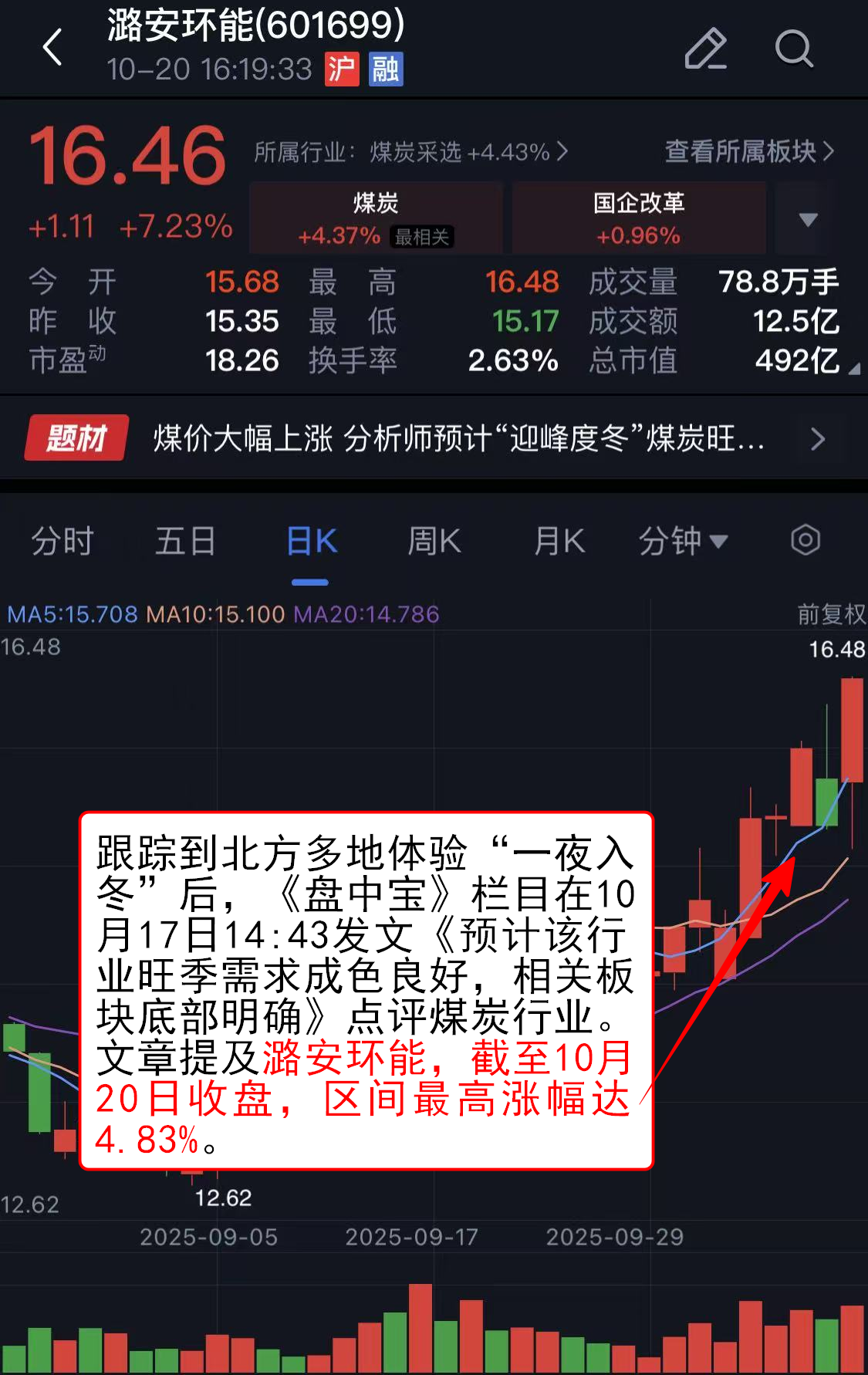 跟踪到北方多地体验“一夜入冬”后,《盘中宝》栏目在10月17日14:43发文《预计该行业旺季需求成色良好,相关板块底部明确》点评煤炭行业。文章指出2025年下半年煤价反弹后,煤企利润有望改善且四季度煤价具备向上弹性,叠加本轮市场转好后,煤炭板块表现明显弱于其他板块,且底部明确,看好板块四季度反弹。文章提及潞安环能,截至10月20日收盘,区间最高涨幅达4.83%。