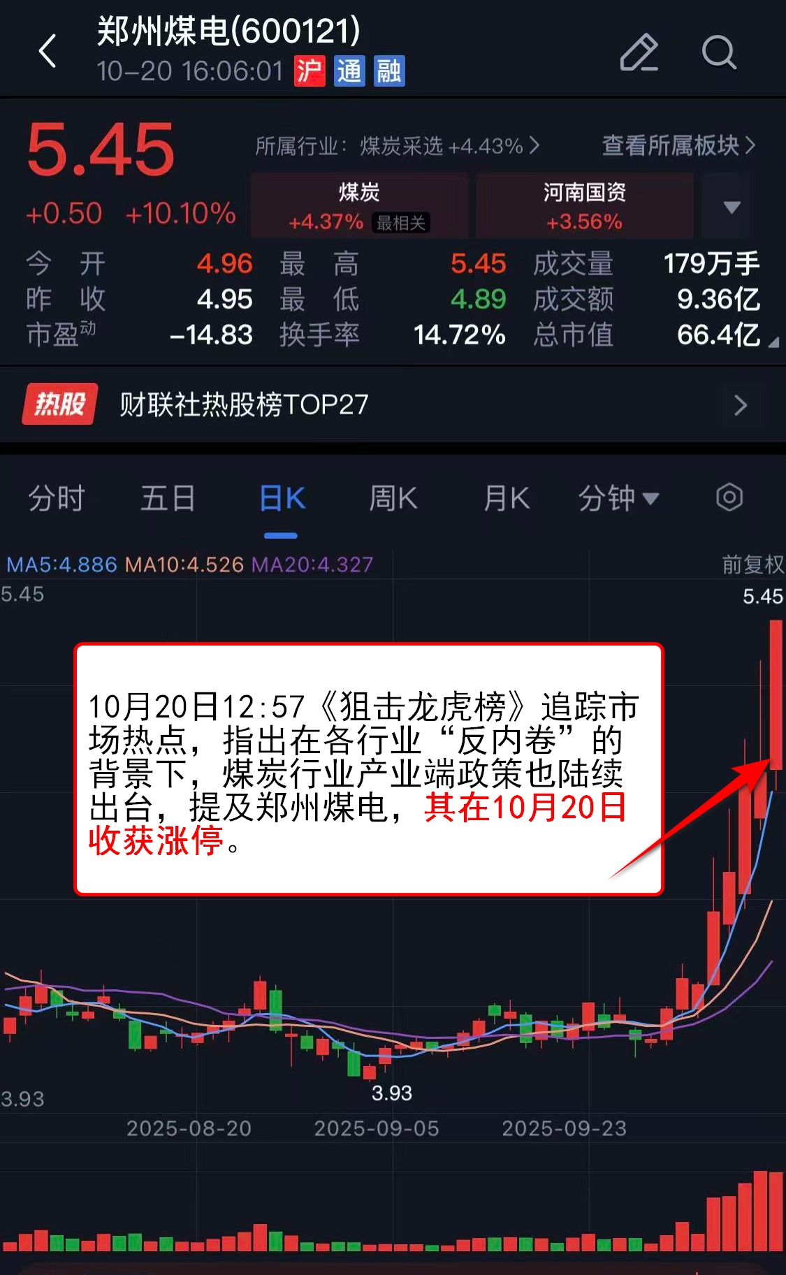 10月20日12:57《狙击龙虎榜》追踪市场热点,指出在各行业“反内卷”的背景下,煤炭行业产业端政策也陆续出台,提及郑州煤电,其在10月20日收获涨停。