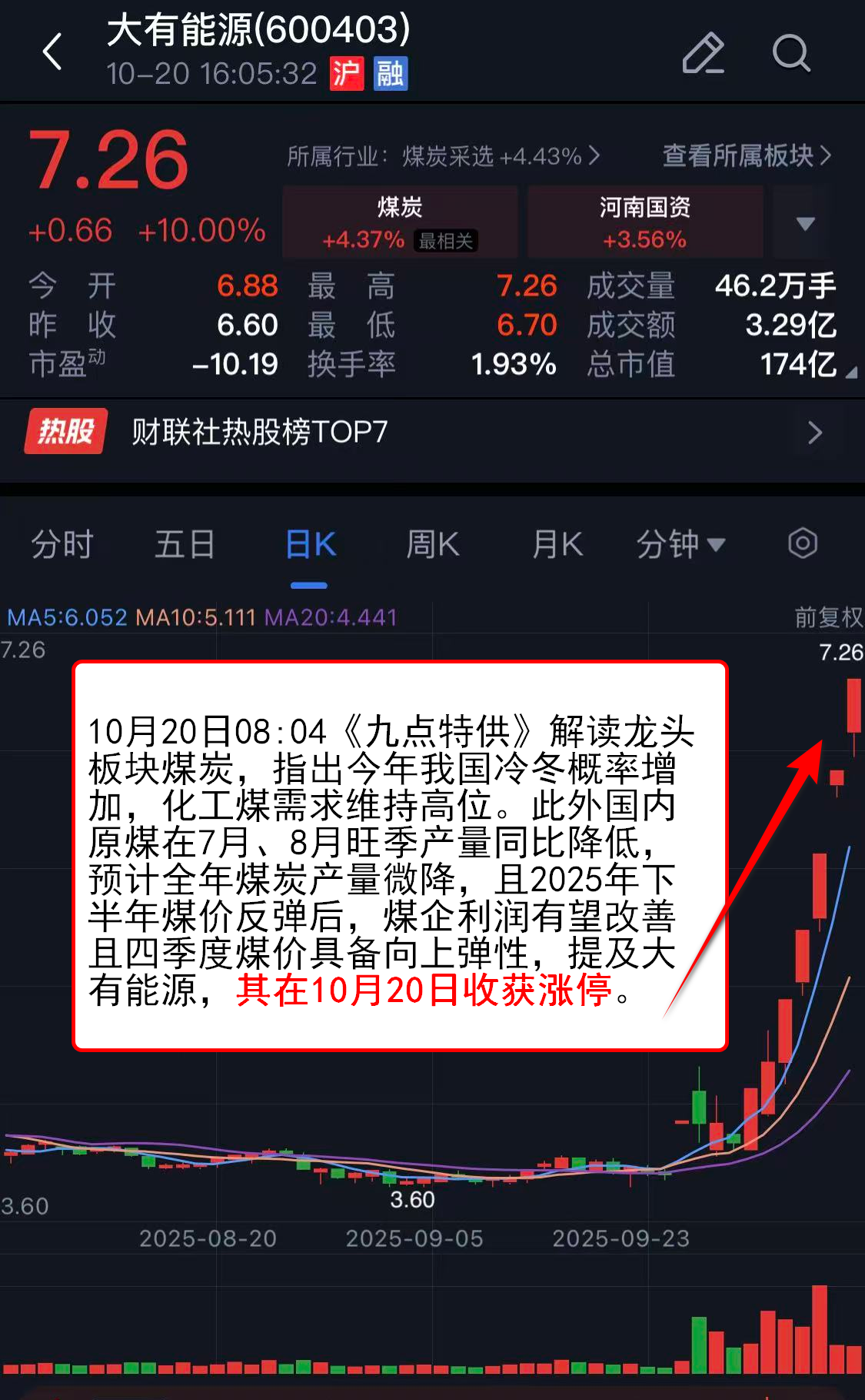 10月20日08:04《九点特供》解读龙头板块煤炭,指出今年我国冷冬概率增加,化工煤需求维持高位。此外国内原煤在7月、8月旺季产量同比降低,预计全年煤炭产量微降,且2025年下半年煤价反弹后,煤企利润有望改善且四季度煤价具备向上弹性,提及大有能源,其在10月20日收获涨停。