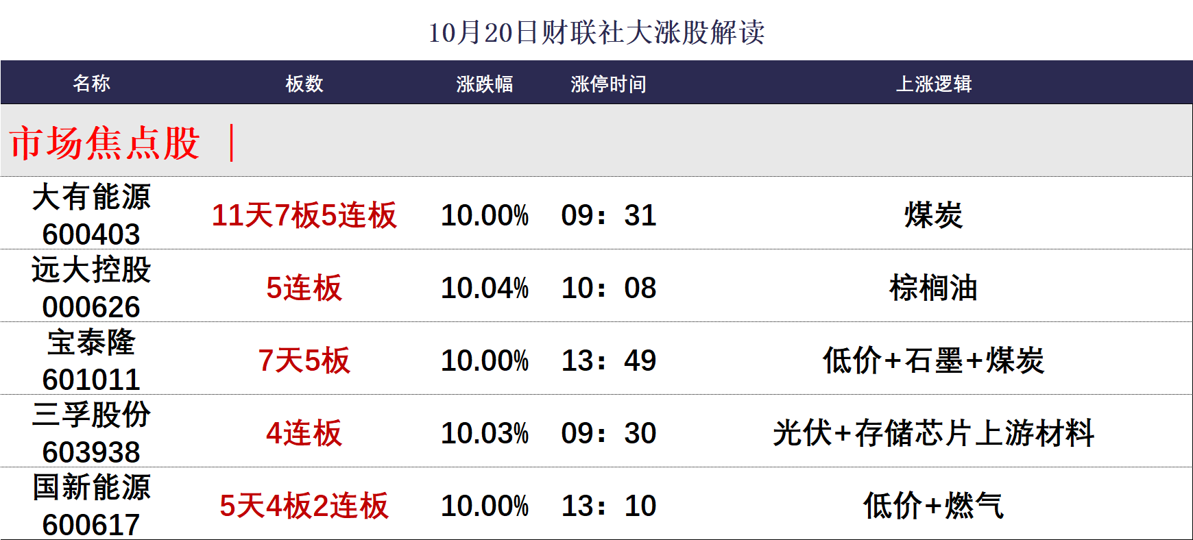财联社10月20日讯,今日76股涨停,17股炸板,封板率为82%,远大控股5连板,大有能源11天7板,三孚股份4连板,睿能科技、安泰集团3连板,宝泰隆7天5板,国新能源5天4板,海鸥住工8天4板,北交所惠丰钻石30cm首板。市场冲高回落,创业板指一度涨超3%。沪深两市成交1.74万亿,较上一个交易日缩量2005亿,成交额创8月8日以来新低。板块方面,培育钻石、煤炭、燃气等板块涨幅居前,有色金属等板块跌幅居前。截至收盘,沪指涨0.63%,深成指涨0.98%,创业板指涨1.98%。