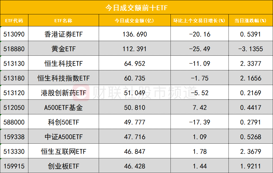 从成交额前十的ETF来看,香港证券ETF(513090)成交额位居首位,黄金ETF(518880)成交额位居次席。
