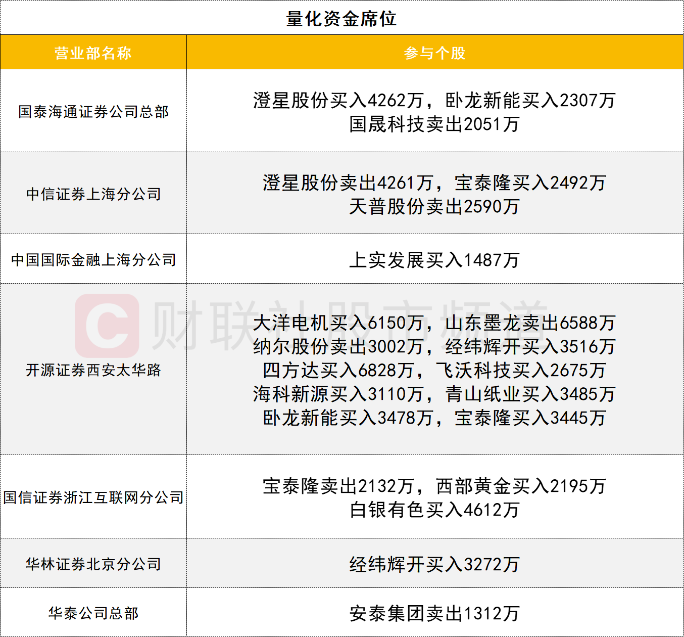 量化资金活跃度不高,经纬辉开获两家量化席位买入6788万。四方达获一家量化席位买入6828万。