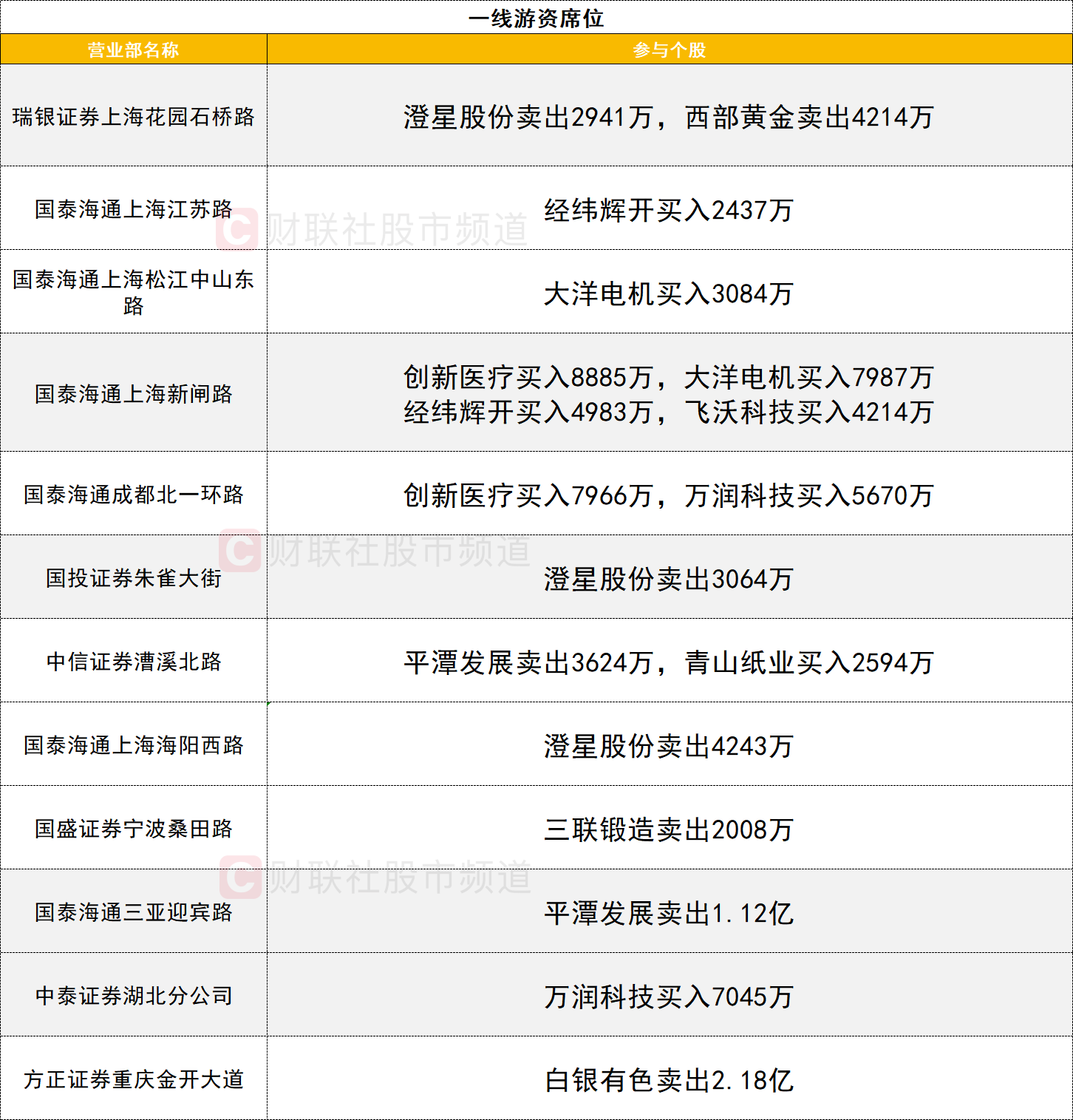 一线游资活跃度下降,白银有色遭一家一线游资席位(重庆金开大道)卖出2.18亿。平潭发展遭一家一线游资席位(国泰海通证券三亚迎宾路)卖出1.12亿。