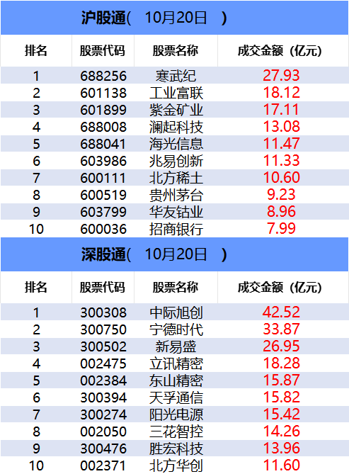 从沪股通前十大成交个股来看,寒武纪位居首位;工业富联、紫金矿业分居二、三位。