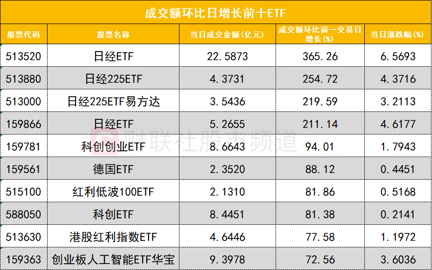 从成交额环比增长前十的ETF来看,日经ETF(513520)成交额环比增长365%位居首位;日经225ETF(513880)成交额环比增长254%位居次席。