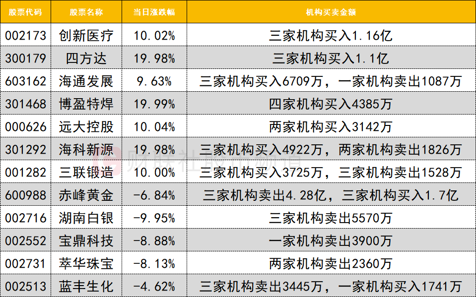 今日龙虎榜机构活跃度明显降低,买入方面,创新医疗获三家机构买入1.16亿。今日超硬材料方向表现活跃,涨停的四方达获三家机构买入1.1亿。