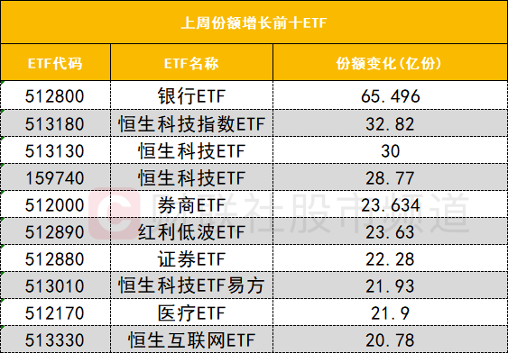 在上周份额增长前十ETF中,银行ETF(512800)上周份额增长65.496亿份位居首位;恒生科技指数ETF(513180)上周份额增长32.82亿份位居次席。