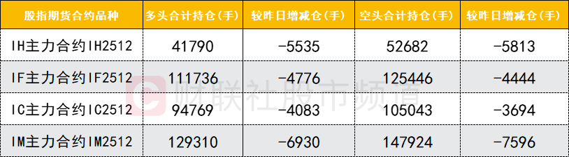 四大期指主力合约中,IH、IF、IC、IM合约多空双方均减仓,IH、IM合约空头减仓数量较多。