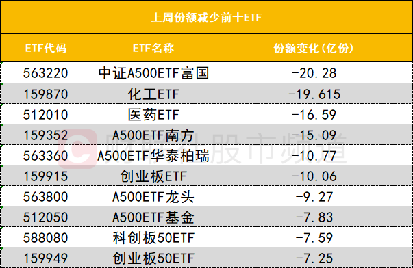 在上周份额减少前十的ETF中,中证A500ETF富国(563220)上周份额减少20.28亿份位居首位。