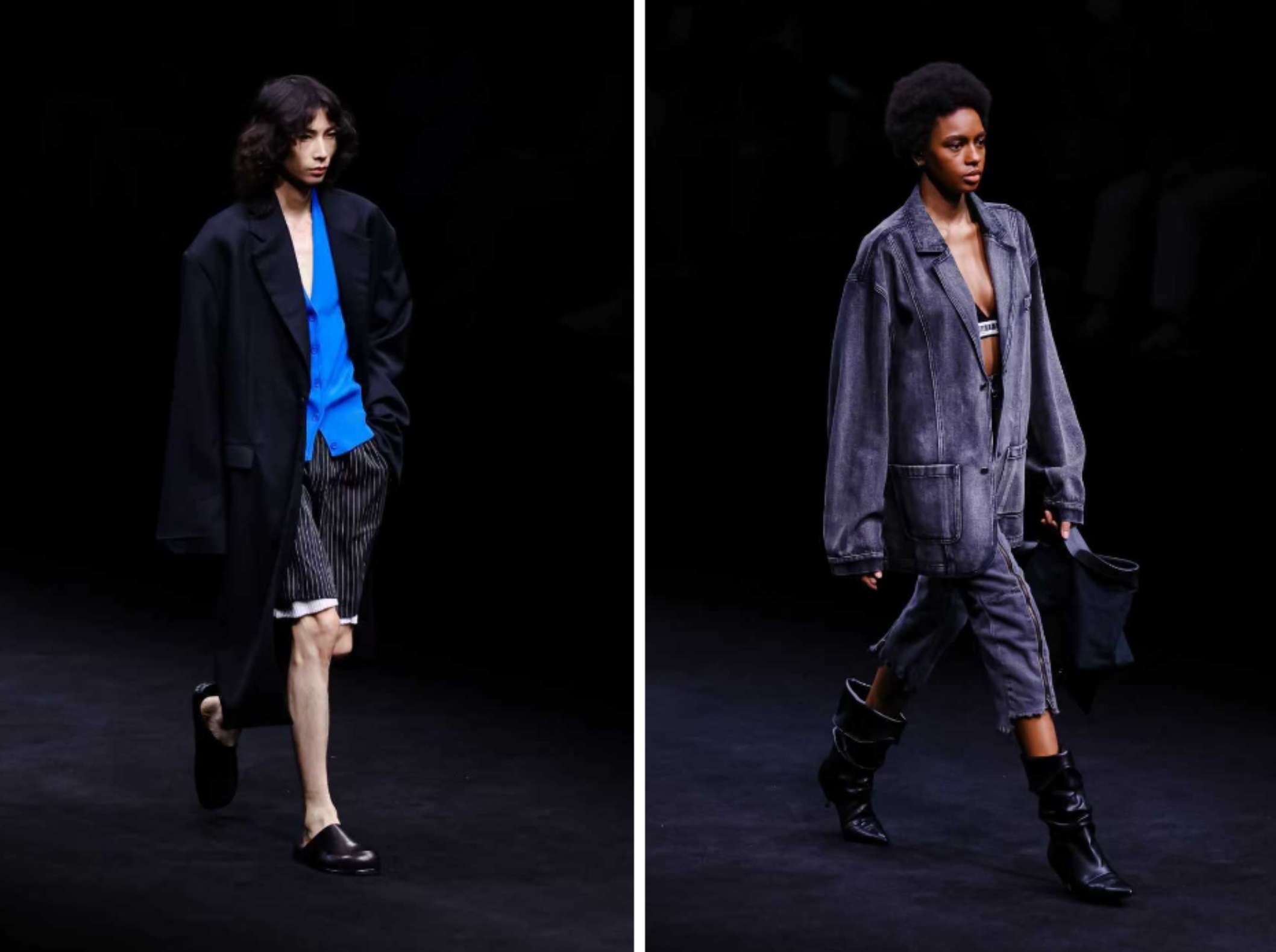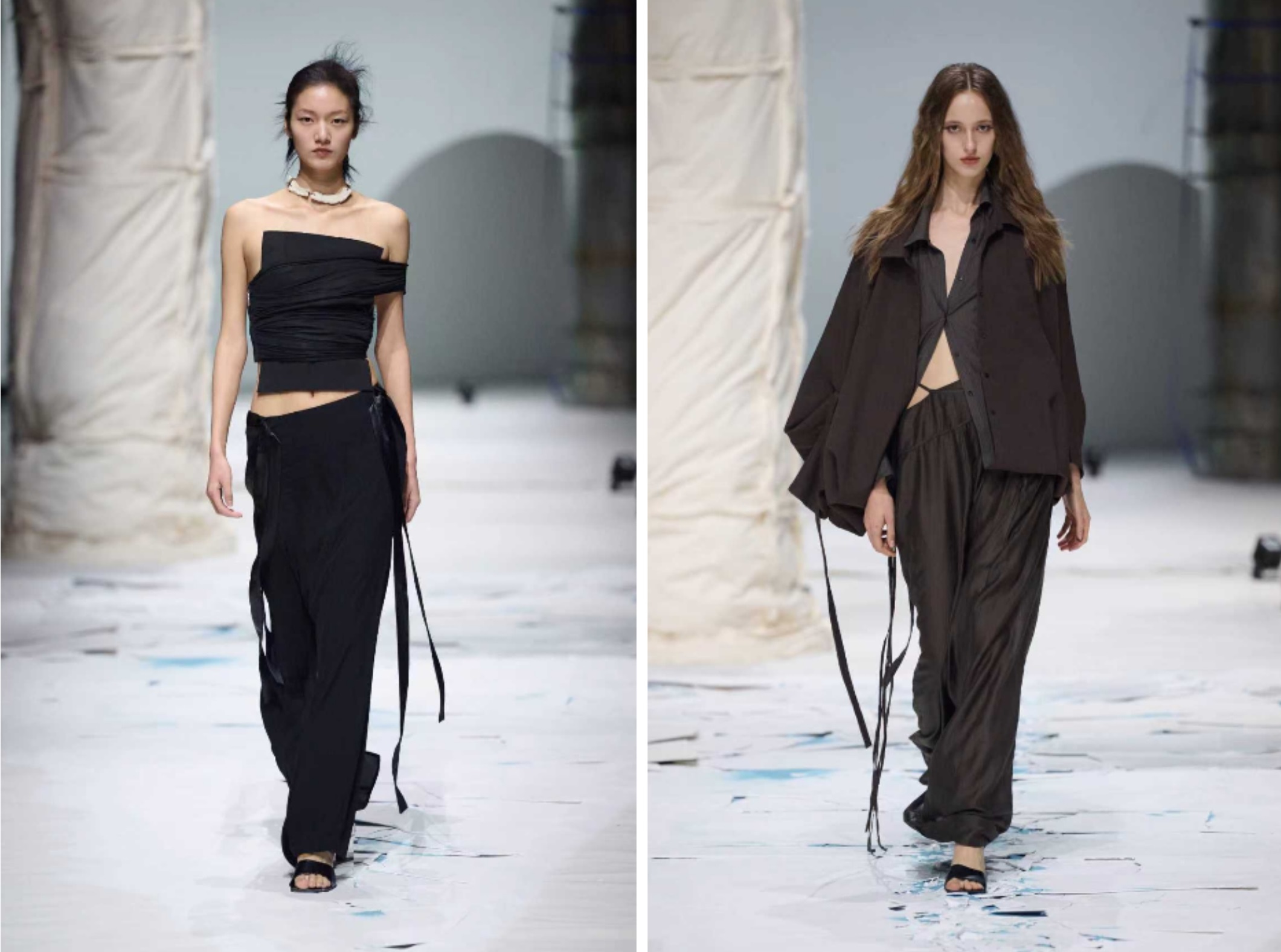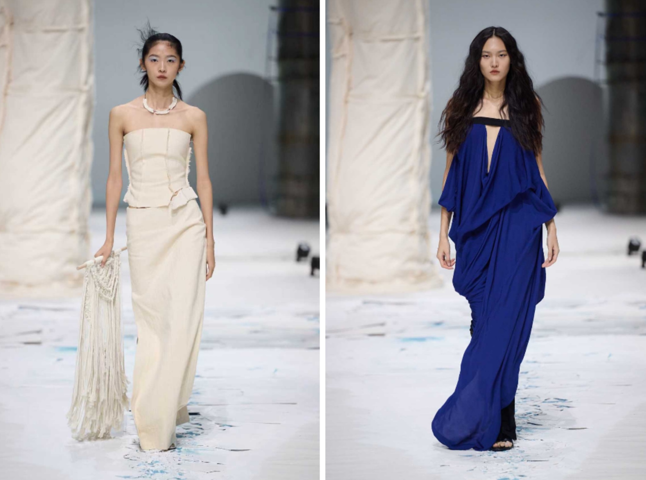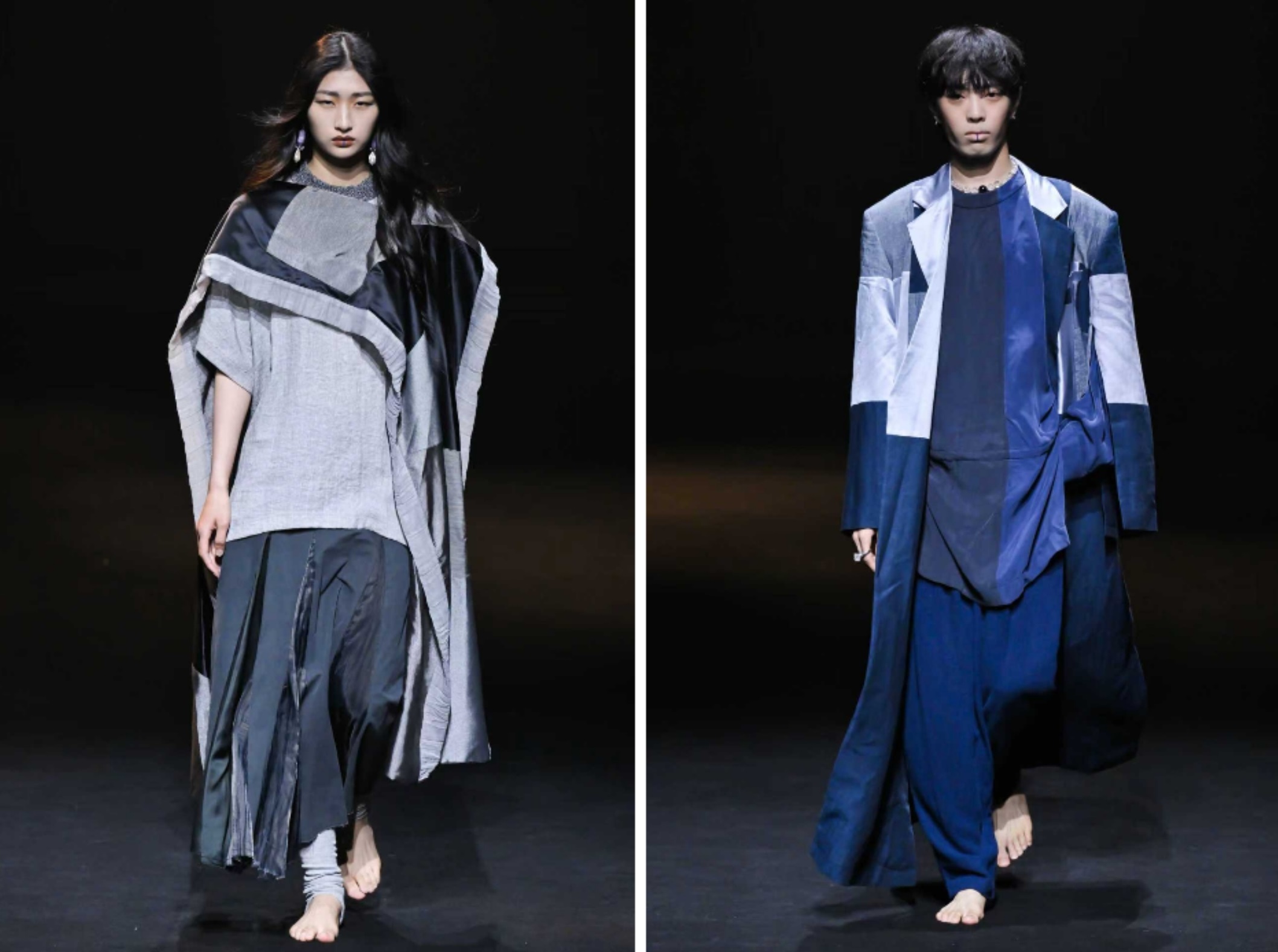 ili node本季作品中对“一衣多穿”概念进行更为极致的演绎,同一组布料在视觉效果上的丰富变换,如同集体创伤下不同人物的相异选择。不对称解构进而赋予其更具张力与生命感的廓形。拼接与重组成为系列中游走的线索,隐喻着个体对自我的修葺与再造。色彩上,蓝色的一抹既是对主题灵感中里斯本彩釉的呼应,亦是伤痕破裂后的底色,深沉冷静却又无限可能。