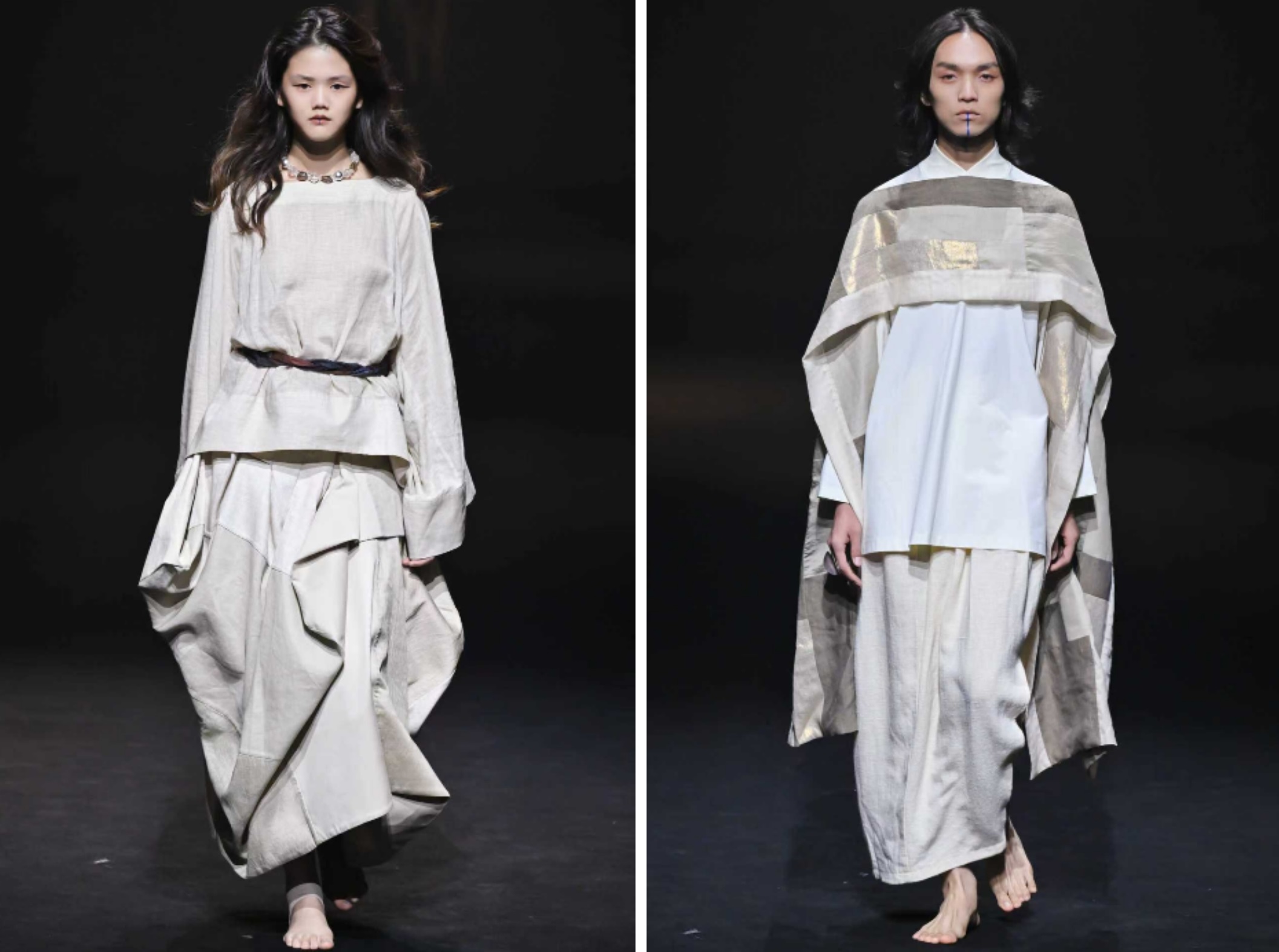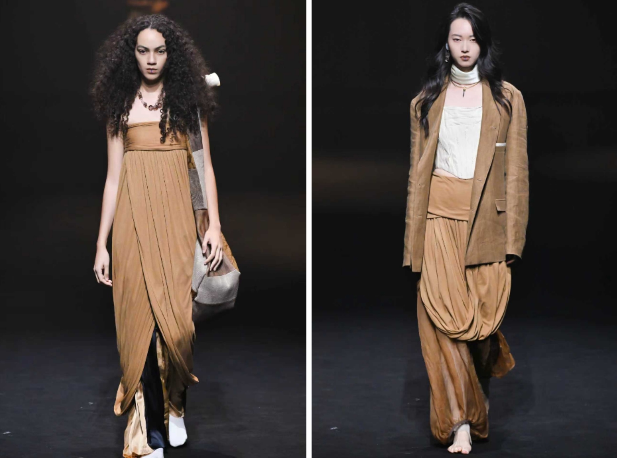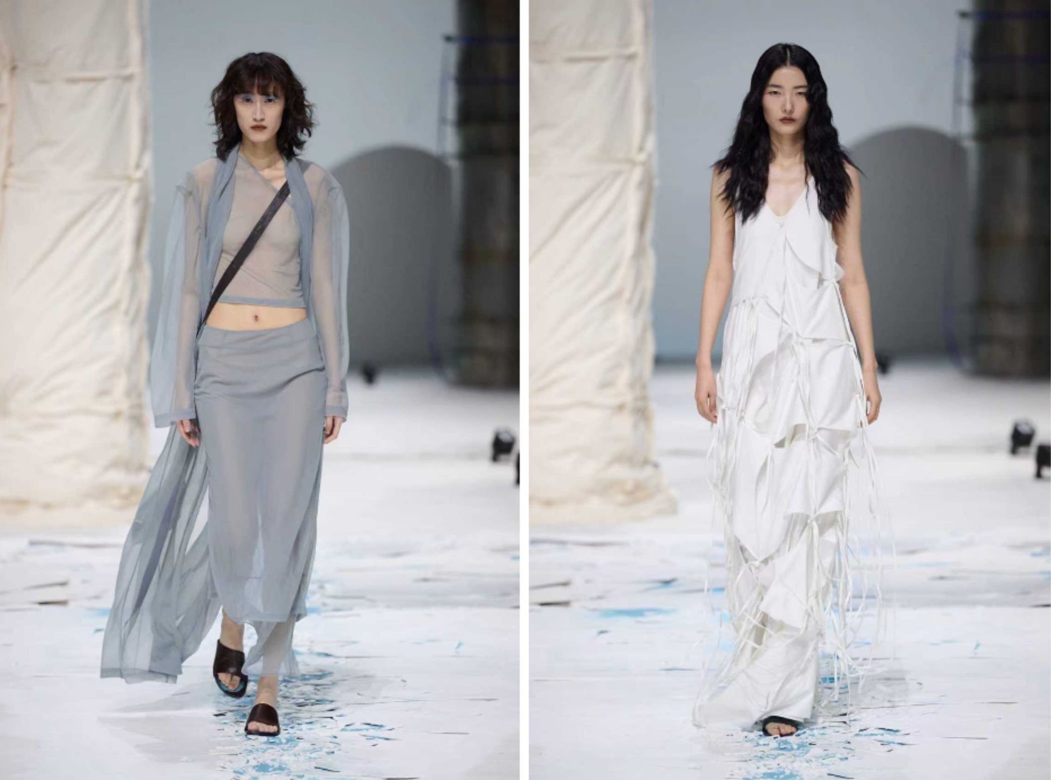场内没有传统音乐,只有细微的声响在空间里流动。像是建筑自己在呼吸,间或夹杂着几不可闻的人声呢喃,如同梦呓。服装在静默中展示着它们的存在,就像田野里的一切。衣服的颜色简单克制,低饱和,像是被正午阳光漂白过。任何多余的华丽装束都被摒弃。设计师说,这不是极简主义,而是一种“频率的稳定”:当一个人的情绪、意志与身体达成一致,进入一个安静但坚定的内在共振状态。