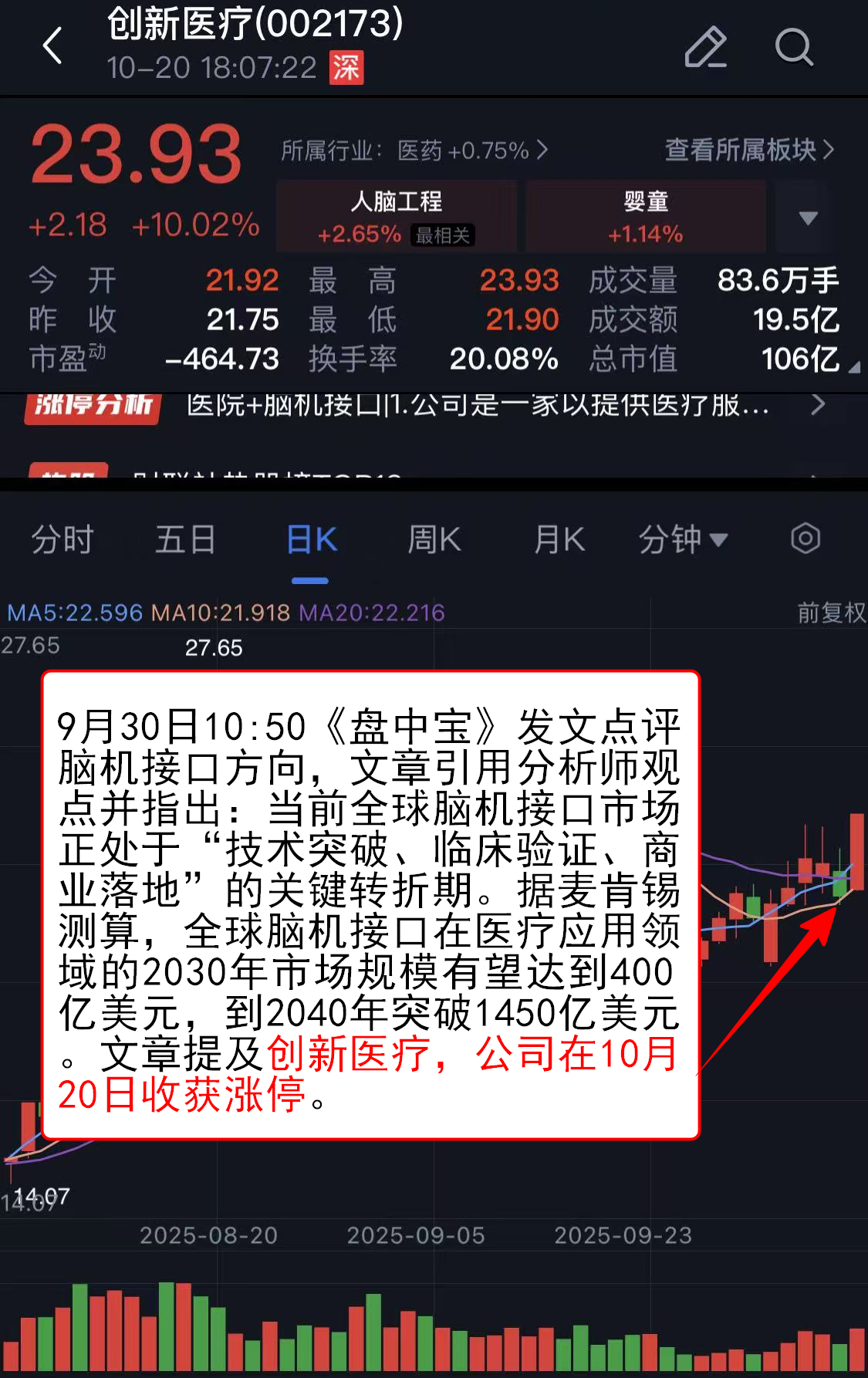 往期回顾:9月30日10:50《盘中宝》发文点评脑机接口方向,文章引用分析师观点并指出:当前全球脑机接口市场正处于“技术突破、临床验证、商业落地”的关键转折期。据麦肯锡测算,全球脑机接口在医疗应用领域的2030年市场规模有望达到400亿美元,到2040年突破1450亿美元。文章提及创新医疗,公司在10月20日收获涨停。