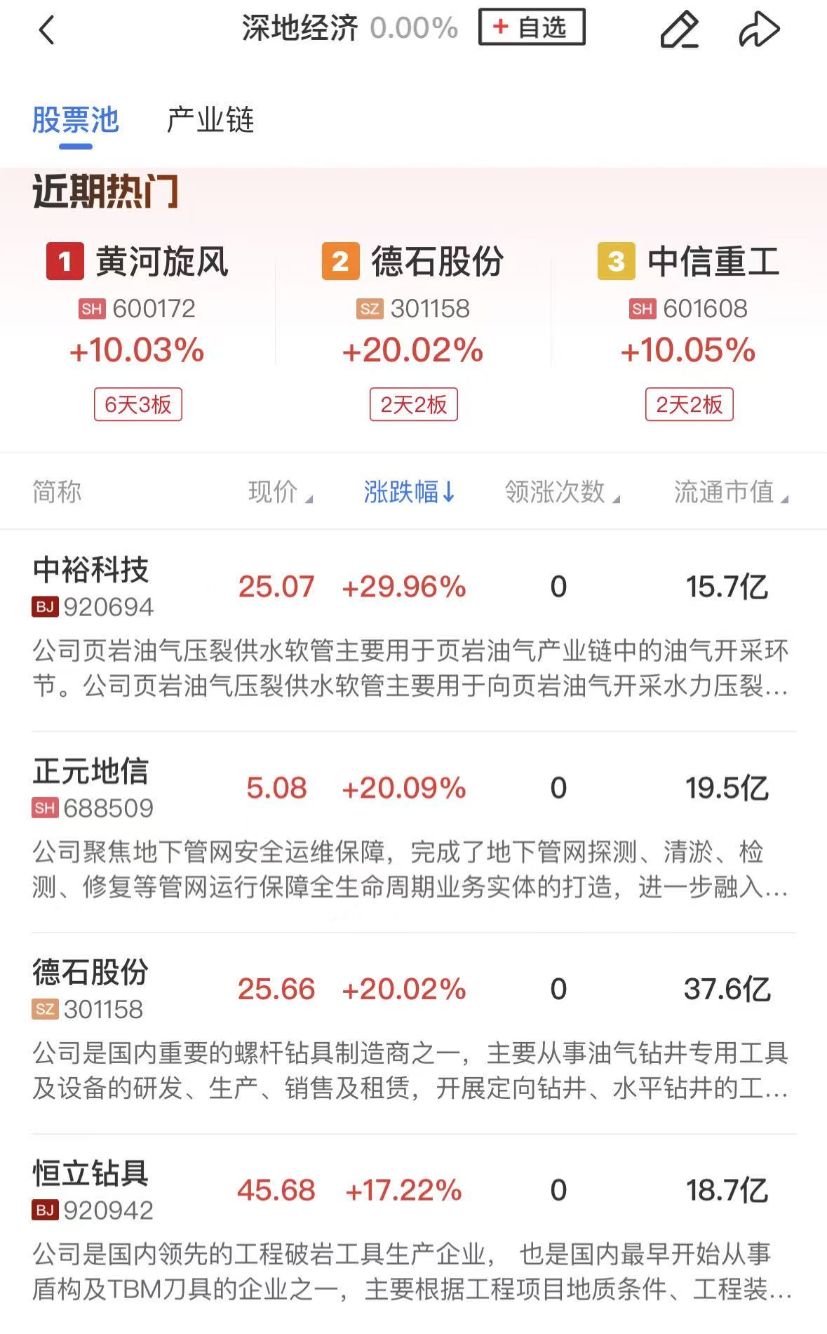 板块上,深地经济概念全线发酵,正元地信20cm涨停,中裕科技、德石股份、山河智能、中化岩土、山东墨龙等多股涨停,恒立钻具、四方达涨超10%。