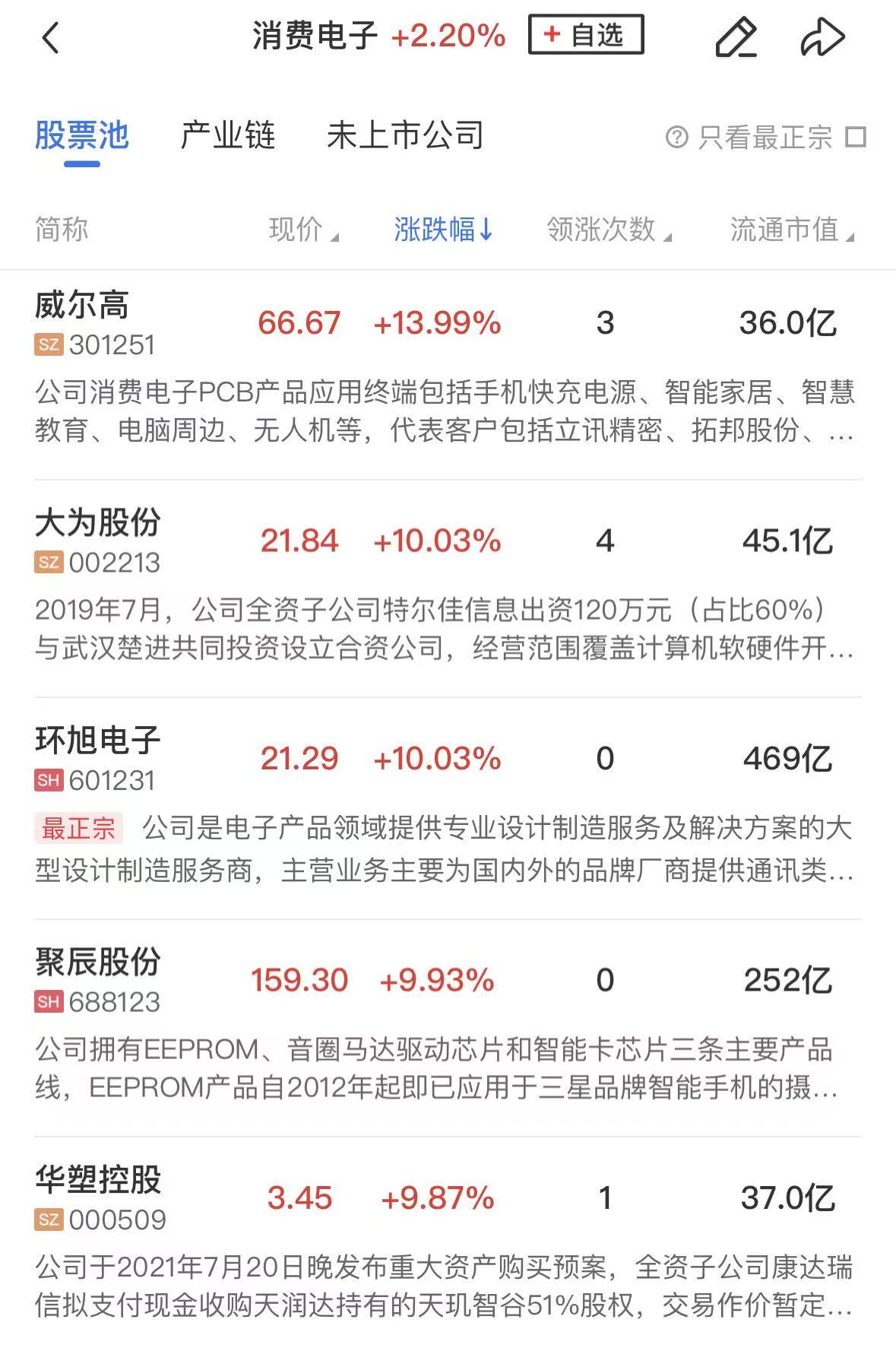 消费电子板块震荡走强,环旭电子涨停,福立旺、立讯精密、弈东电子、歌尔股份、工业富联等个股涨幅居前。