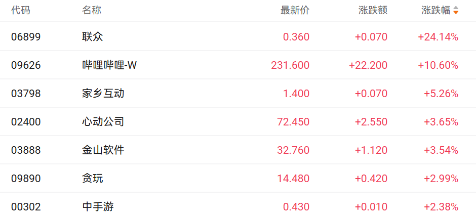 游戏板块同步走强,联众(06899.HK)、金山软件(03888.HK)分别上涨24.14%、3.54%.