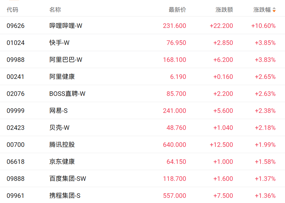 从盘面表现看,科技、游戏、锂电池及消费电子板块成为市场领涨主力,其中科技股表现尤为亮眼。截至午间收盘,哔哩哔哩-W(09626.HK)、快手-W(01024.HK)、阿里巴巴-W(09988.HK)分别上涨10.60%、3.85%、3.83%,引领科网股走强。