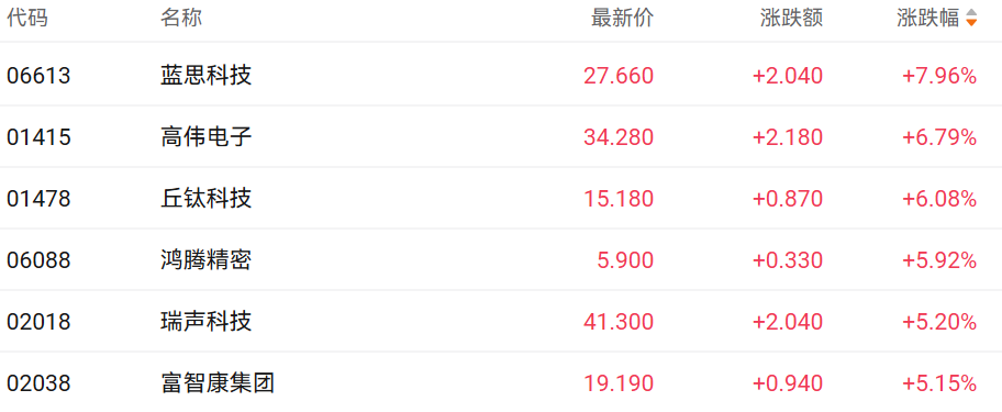 消费电子股受苹果新品销售强劲提振,蓝思科技(06613.HK)、高伟电子(01415.HK)、丘钛科技(01478.HK)分别上涨7.96%、6.79%、6.08%。