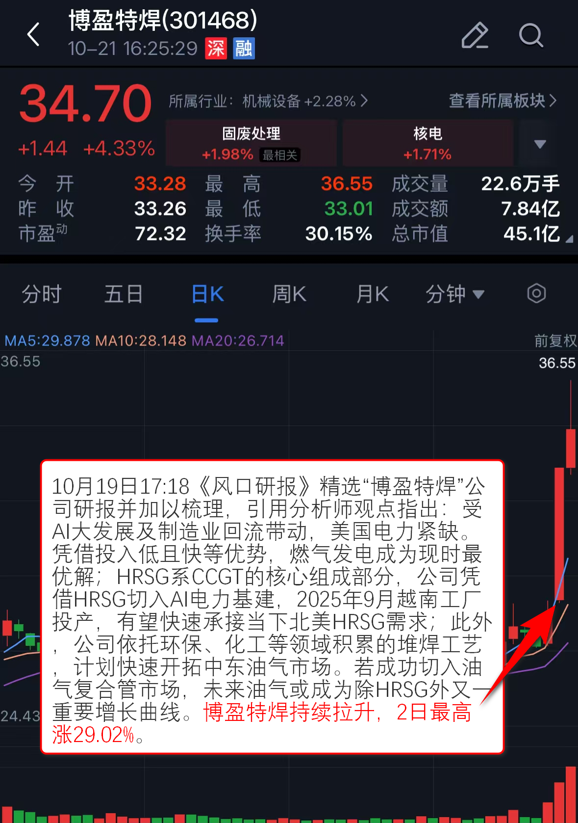 往期回顾:10月19日17:18《风口研报》精选“博盈特焊”公司研报并加以梳理,引用分析师观点指出:受AI大发展及制造业回流带动,美国电力紧缺。凭借投入低且快等优势,燃气发电成为现时最优解;HRSG系CCGT的核心组成部分,公司凭借HRSG切入AI电力基建,2025年9月越南工厂投产,有望快速承接当下北美HRSG需求;此外,公司依托环保、化工等领域积累的堆焊工艺,计划快速开拓中东油气市场。若成功切入油气复合管市场,未来油气或成为除HRSG外又一重要增长曲线。博盈特焊持续拉升,2日最高涨29.02%。