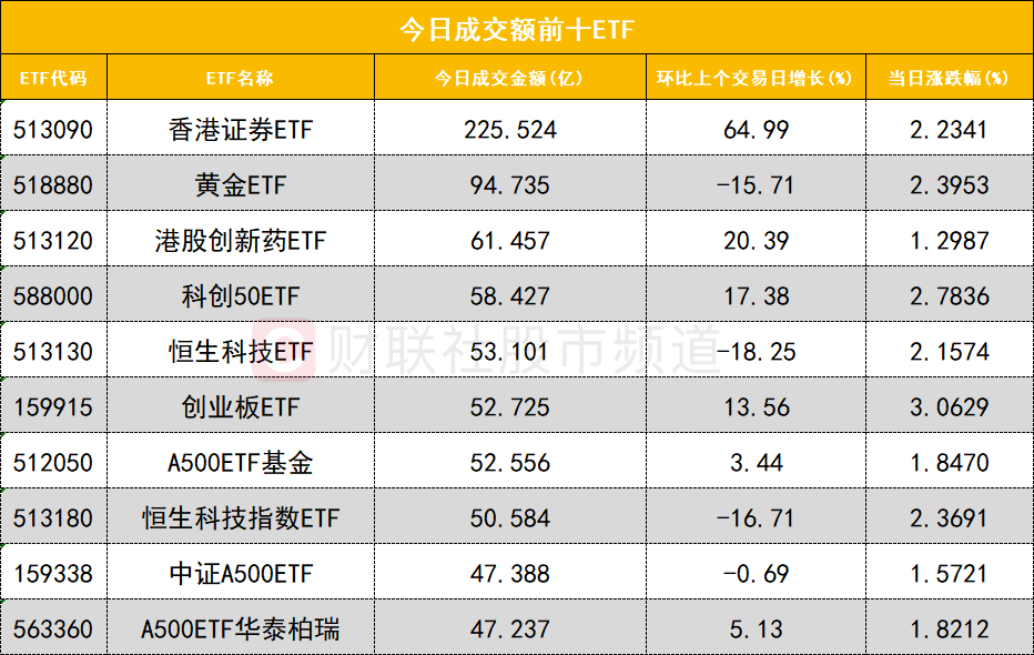 从成交额前十的ETF来看,香港证券ETF(513090)成交额位居首位,黄金ETF(518880)成交额位居次席。