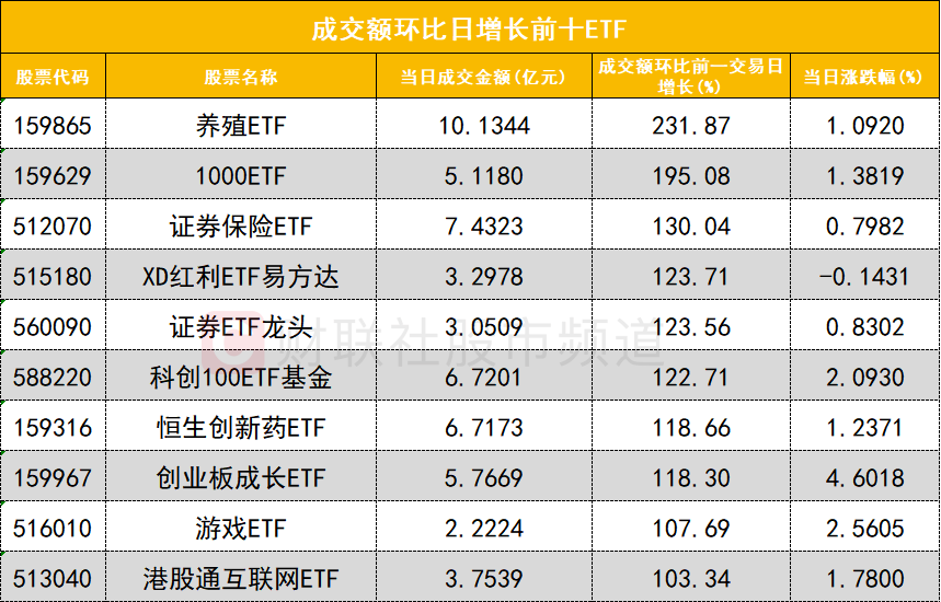 从成交额环比增长前十的ETF来看,养殖ETF(159865)成交额环比增长231%位居首位;1000ETF(159629)成交额环比增长195%位居次席。
